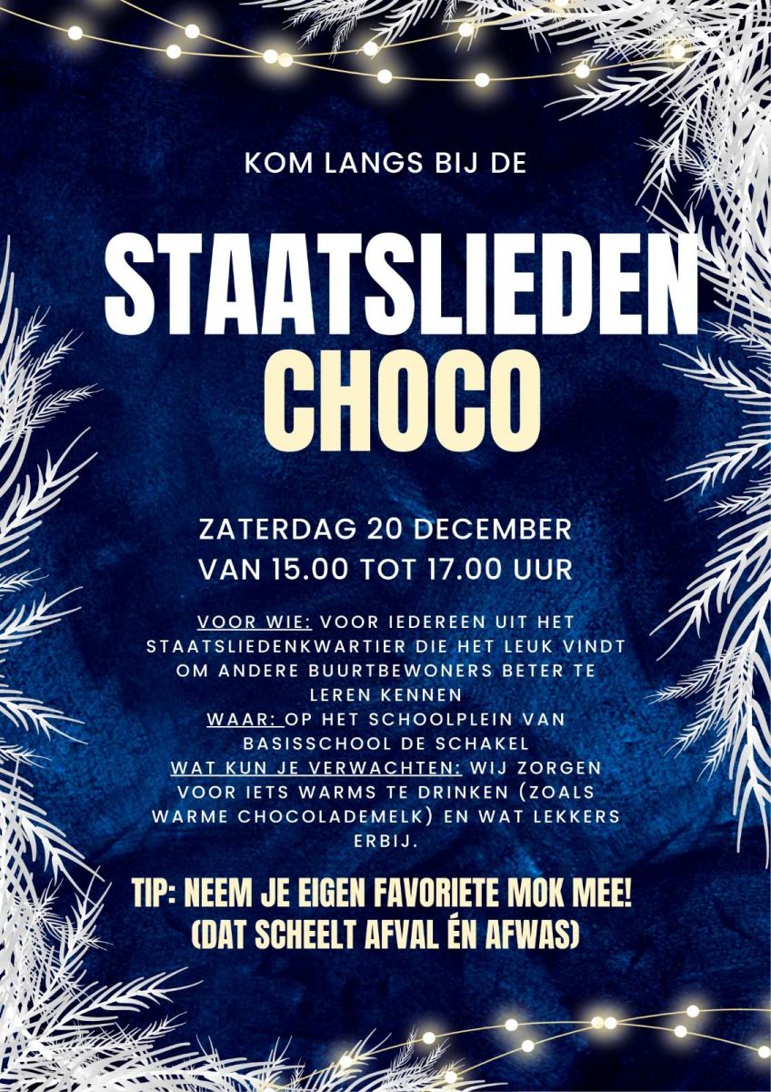 Deze gezellige buurtbijeenkomst wordt onder de naam ‘StaatsliedenChoco’ gehouden op zaterdag 20 december van 15:00-17:00 uur. Plaats van handeling is het schoolplein van KBS De Schakel. Neem je eigen mok mee, dan zorgt de organisatie voor het vullen daarvan en wat lekkers er bij. Kom in grote getale, zodat we er een feestje van kunnen maken!