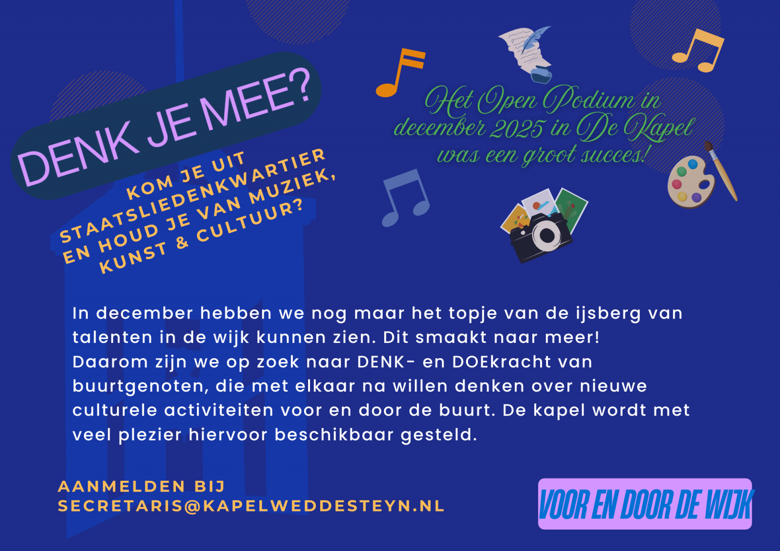 26/03/2026 - Het Open Podium op 12 december 2025 in Kapel Weddesteyn was een groot succes. En juist omdat dit de eerste keer was, heeft het aanbod ons positief verrast!